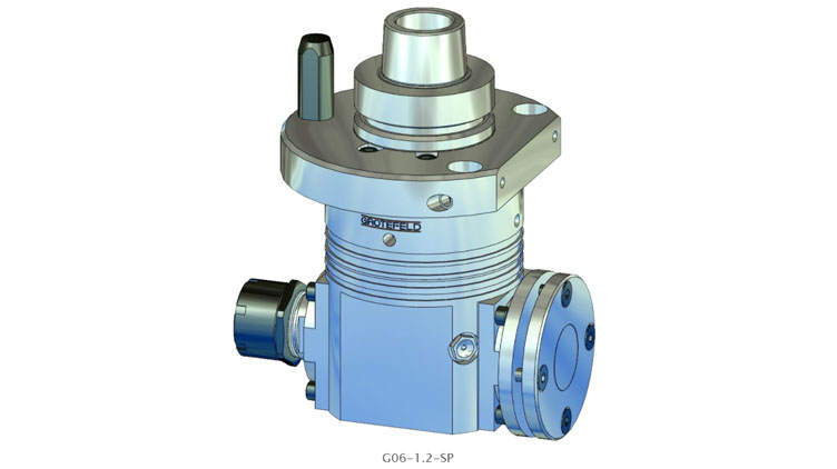 G06-1.2 系列角頭具有帶兩個刀架的連續(xù)加工主軸。這意味著兩個刀架之一的主軸旋轉(zhuǎn)方向與驅(qū)動旋轉(zhuǎn)方向相同,另一個刀架的主軸旋轉(zhuǎn)方向與驅(qū)動方向相反。驅(qū)動速度以 1:1.55 的比例傳遞到刀架。間歇運行時主軸最高轉(zhuǎn)速可達(dá) 20,000 rpm。