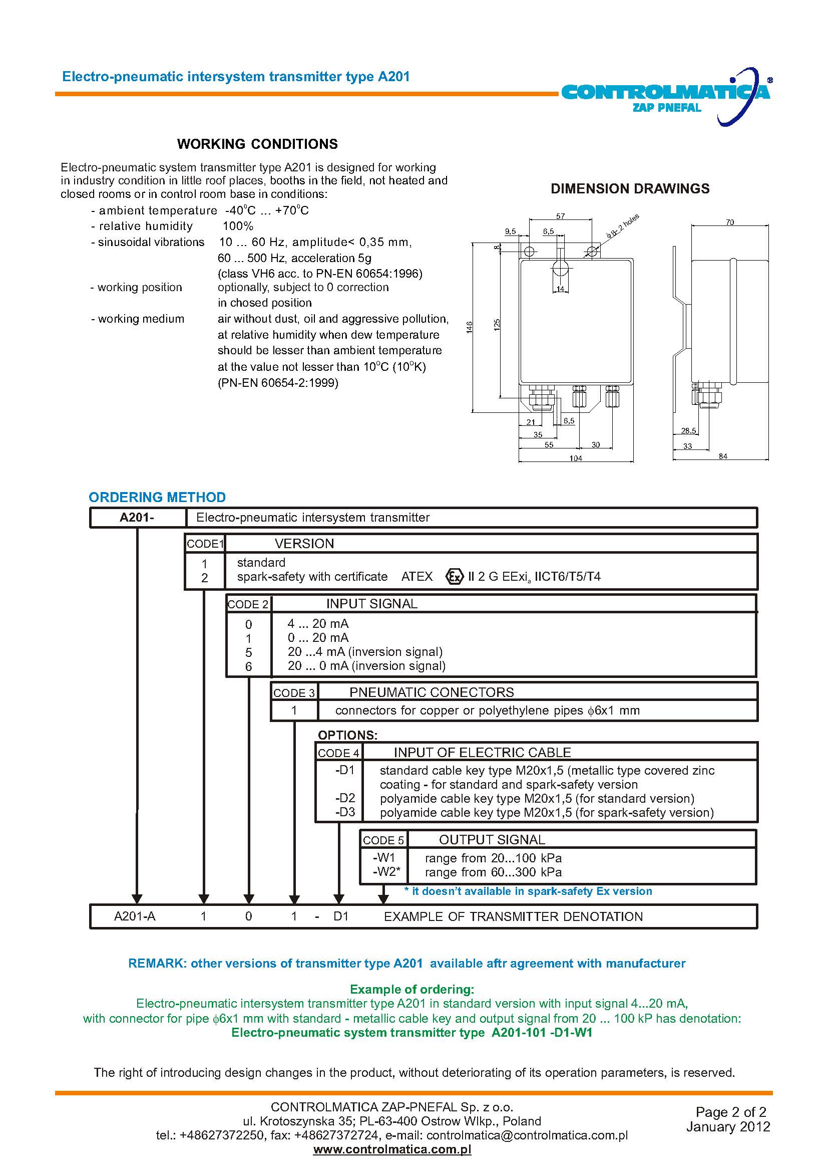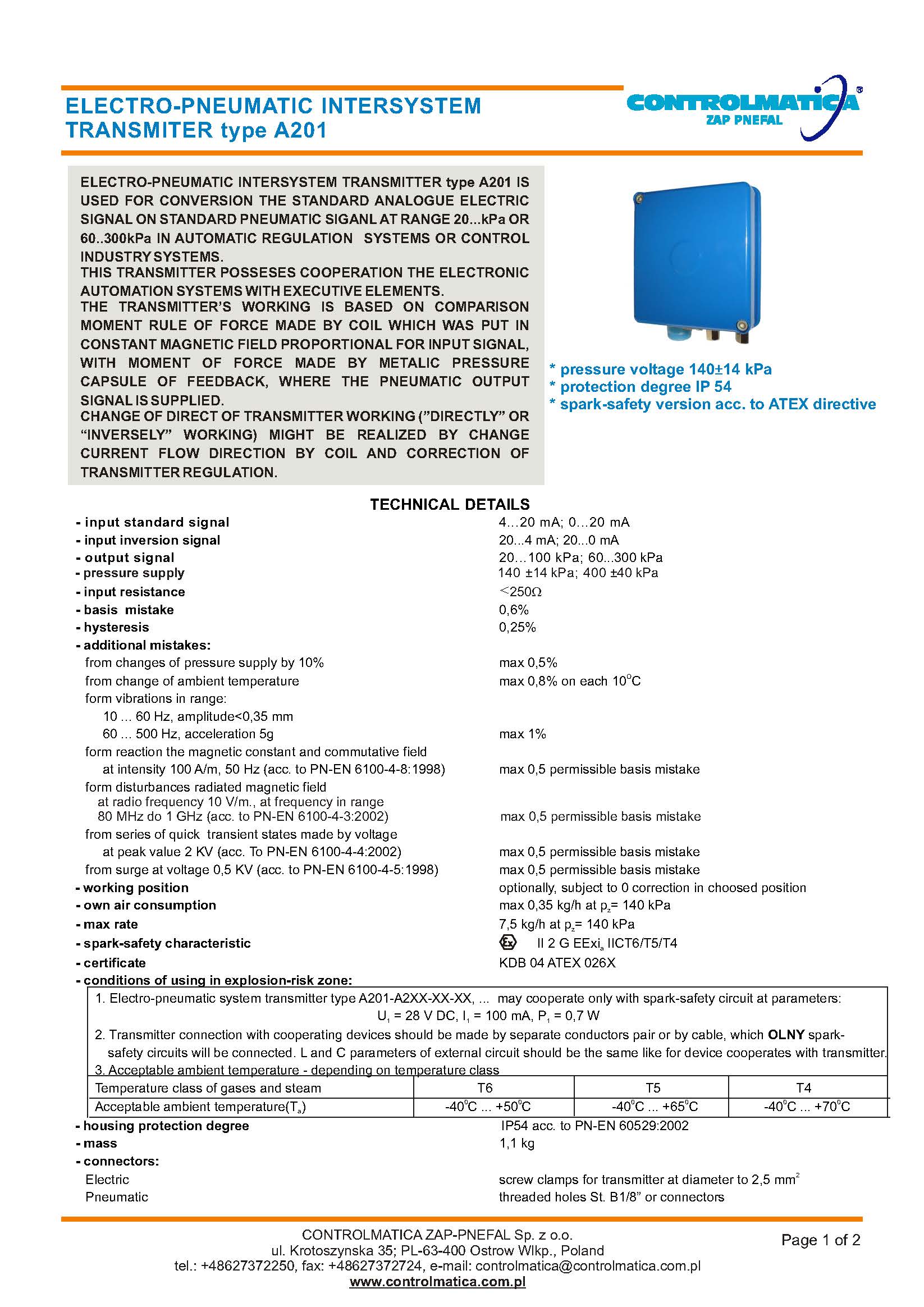 轉換器 I/P 型號A201-波蘭APLISENS