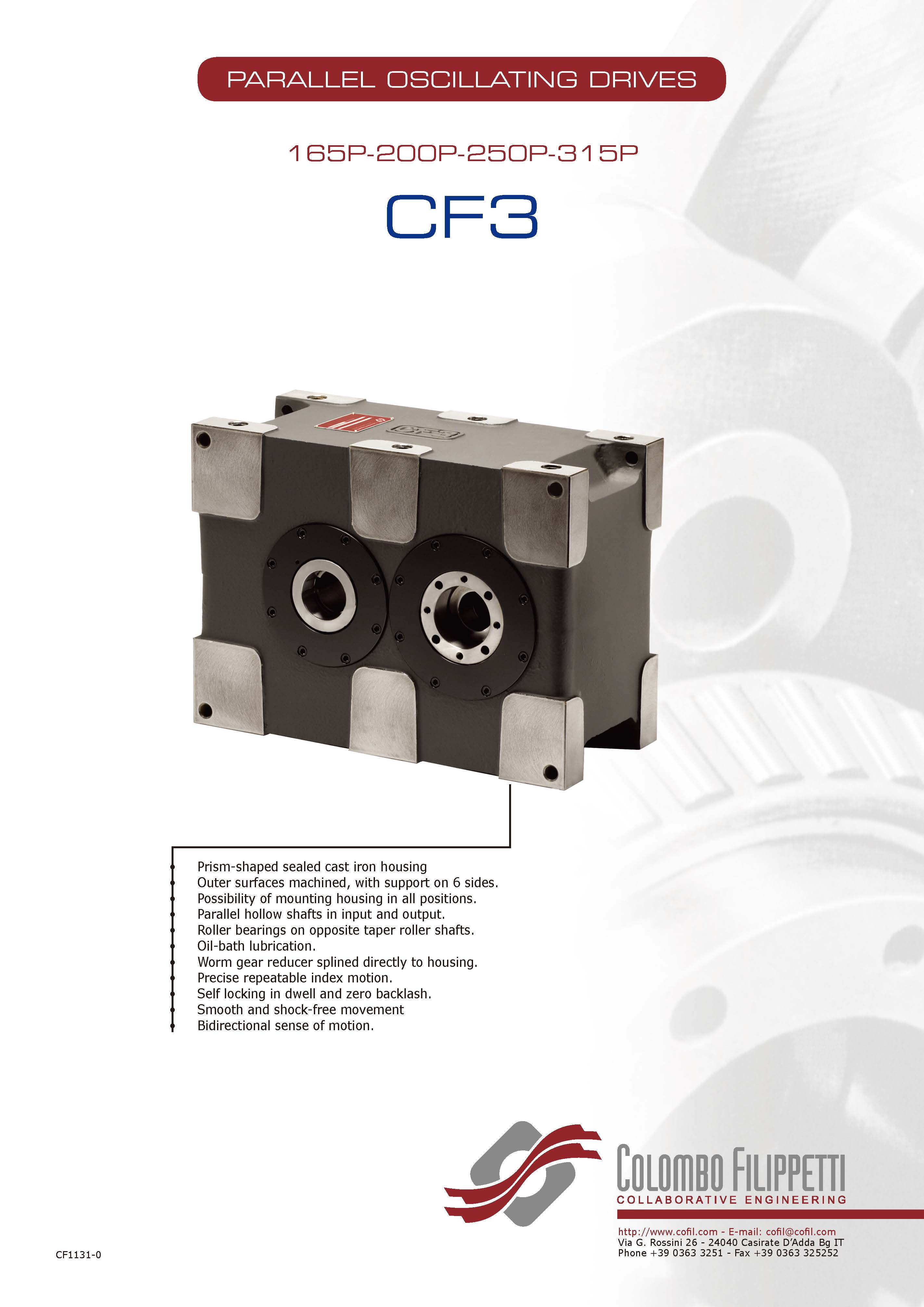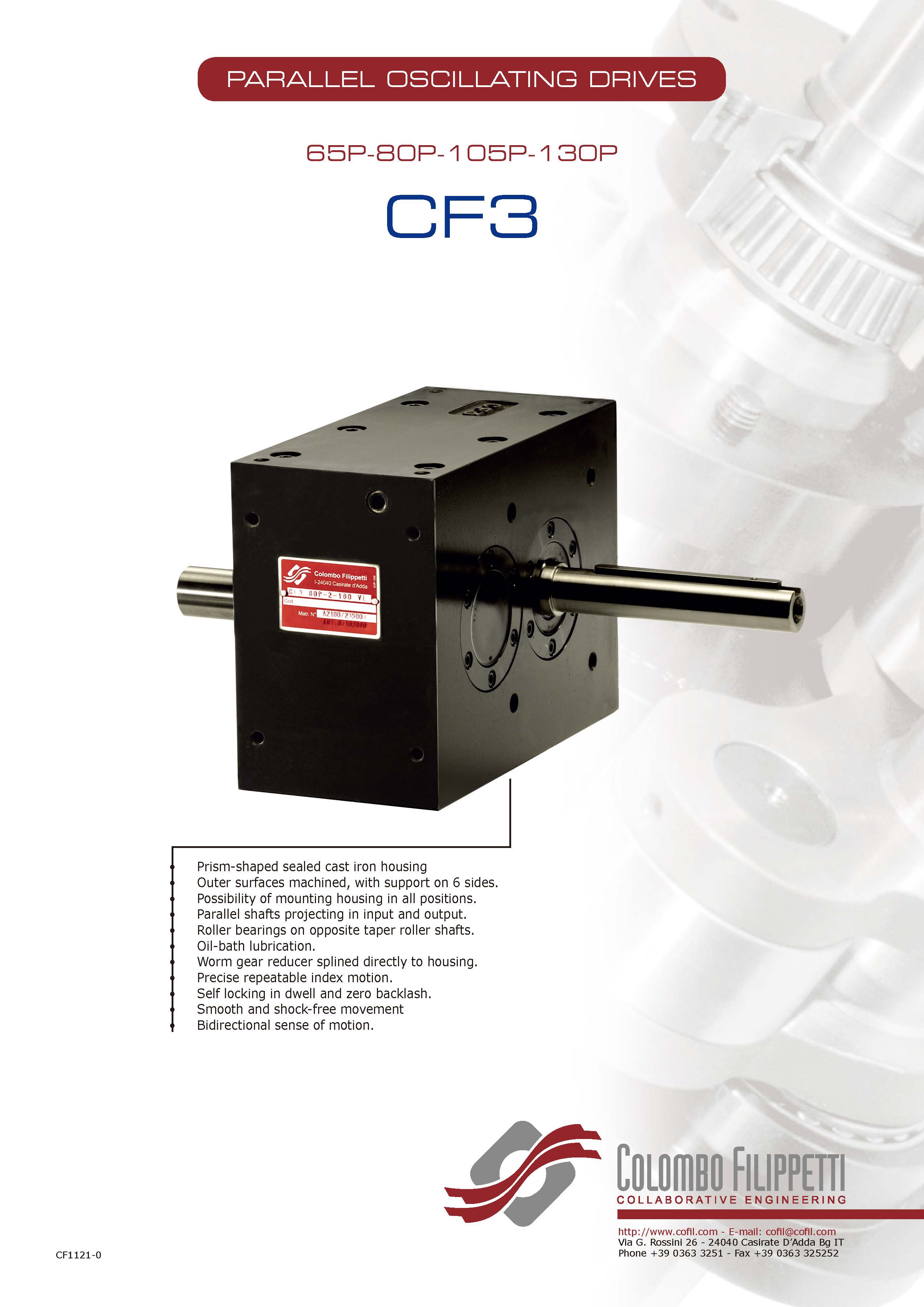 COLOMBO FILIPPETTI spa 的 CF3 擺動驅(qū)動器是具有互補(bǔ)輪廓的雙平面凸輪機(jī)構(gòu),用于將均勻的輸入旋轉(zhuǎn)運(yùn)動轉(zhuǎn)換為輸出擺動運(yùn)動。